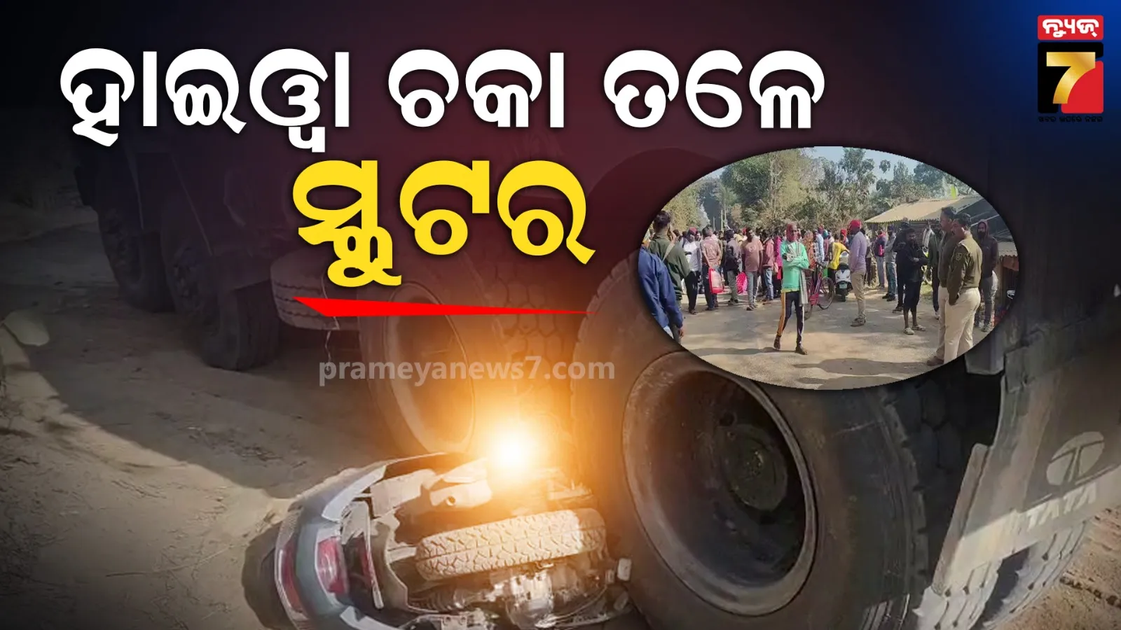 ଜଳେଶ୍ବର ୮।୧: ସ୍କୁଟରକୁ ଓଭରଟେକ୍ କରି ଯାଉଥିବା ବେଳେ ଧକ୍କା ଦେଲା ହାଇୱା । ହାଇୱାର ପଛ ଚକା ଭିତରେ ପଶିଗଲା ସ୍କୁଟର । ଅଳ୍ପକେ ରକ୍ଷା ପାଇଲେ ସ୍କୁଟି ଚାଳକ । ବେଆଇନ ବାଲି ପରିବହନ ପାଇଁ ଦୁର୍ଘଟଣା ଘଟିଛି ବୋଲି ଦାବି କରି ଘଟ