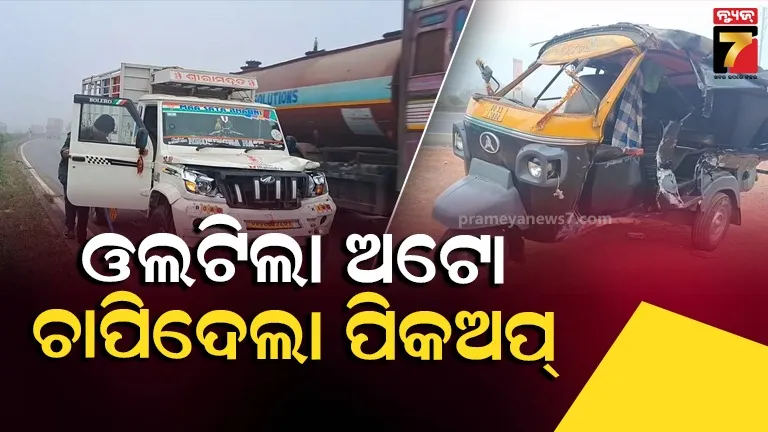 ଘନ କୁହୁଡ଼ିରେ ଦେଖାଗଲାନି ରାସ୍ତା : ଡିଭାଇଡରରେ ପିଟିହୋଇ ଓଲଟିଲା ଅଟୋ, ଯାତ୍ରୀଙ୍କୁ ଚାପିଦେଲା ପିକଅପ୍ ଭ୍ୟାନ୍