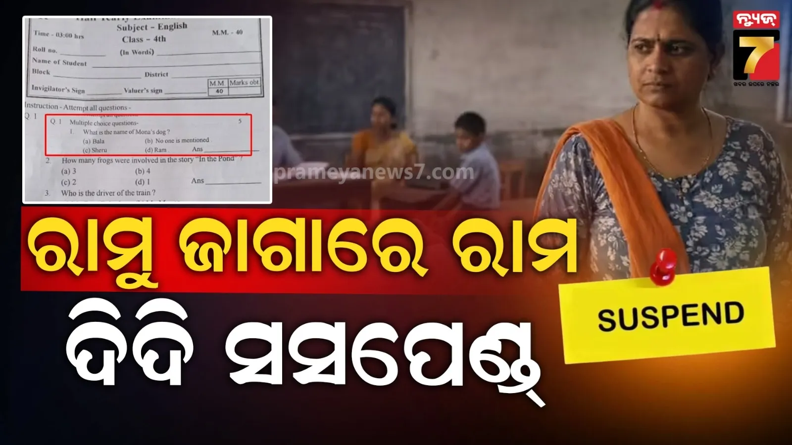 ରାୟପୁର, ୧୨/୦୧:ପ୍ରଶ୍ନପତ୍ରରେ ସାଙ୍ଘାତିକ ଭୁଲ । ସସପେଣ୍ଡ ହେଲେ ବଡ ଦିଦି । ଆଉ ଜଣେ ଦିଦି ବି ସବୁଦିନ ପାଇଁ ବିଦା ହେଲେ । ଛତିଶଗଡ ରାୟପୁରରେ ଥିବା ସରକାରୀ ସ୍କୁଲର ପ୍ରଶ୍ନକୁ ନେଇ ଏବେ ସବୁଠି ଚର୍ଚ୍ଚା ।ଚତୁର୍ଥ ଶ୍ରେଣୀର ଇଂରାଜୀ ପରୀକ୍ଷ...